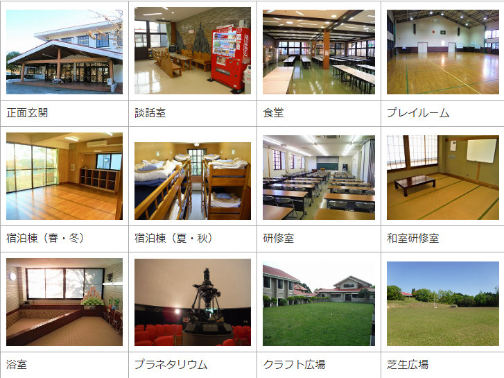 各棟にトイレ(女子用、男子用大1小2)完備研修室管理棟2階120名(60名×2室)暗幕設備・スクリーン和室研修室管理棟2階 15畳1室・10畳1室浴室男女浴場(各24名入浴可能)ドライヤー持ち込み不可プラネタリウム8.5mドーム 78席 投影機 五藤光学GS-T 113㎡食堂254㎡ 250名収容プレイルーム357㎡(軽スポーツ・レクリエーションなど)芝生広場4,900㎡(各種集会・野外レク・スポーツなど) 石灰の使用不可